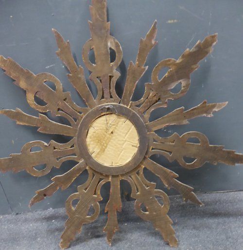 Ref 7569 - Large carved giltwood sunburst mirror with original glass. Circa 1960.