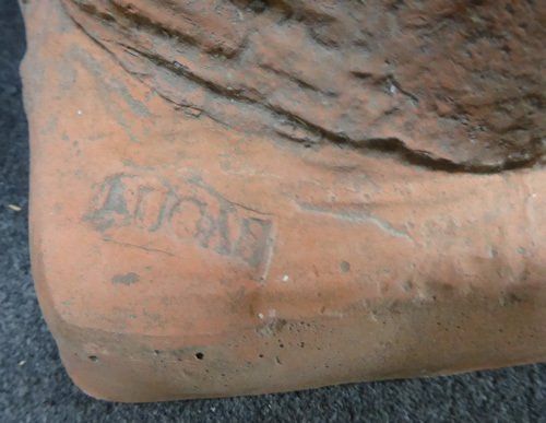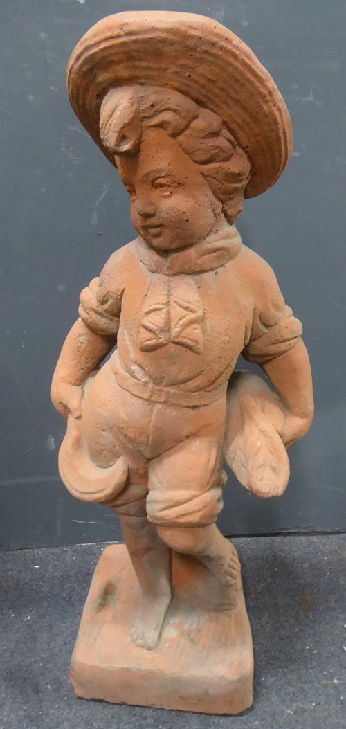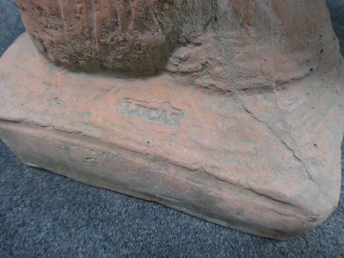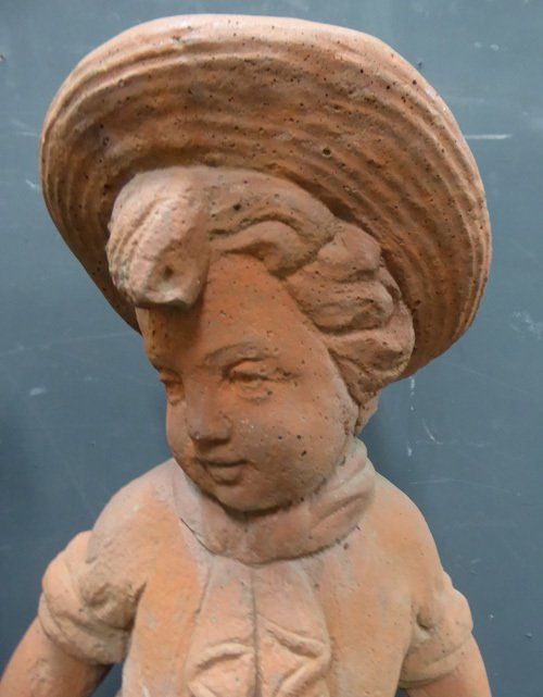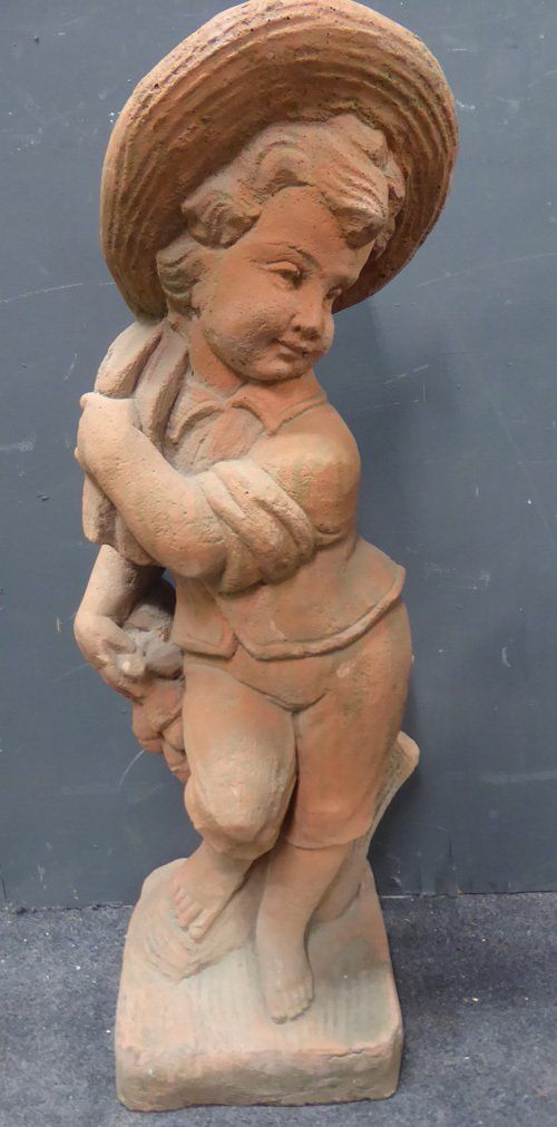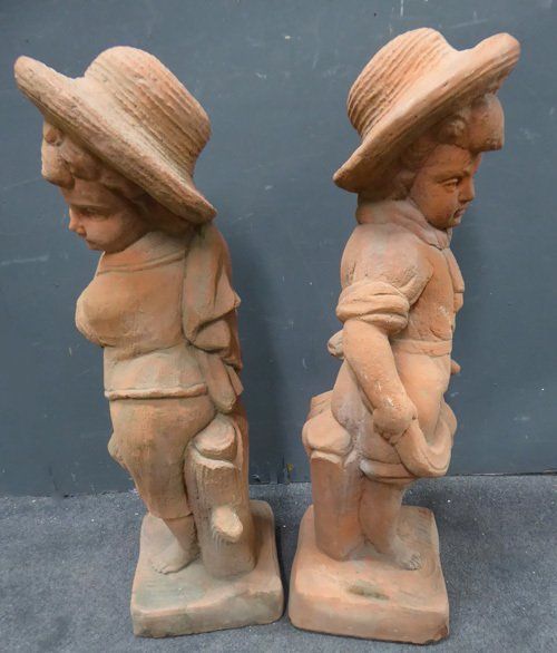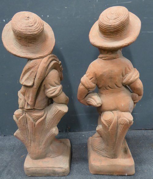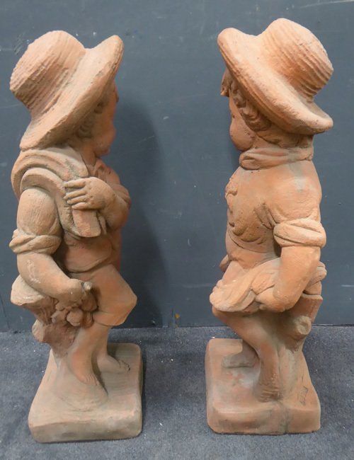 Ref 7573 - Pair of well patinated terracotta statues, "country boys", stamped "Lucas". Circa 1930