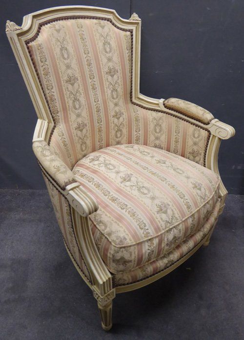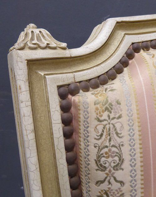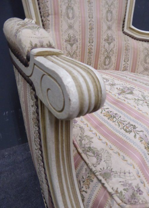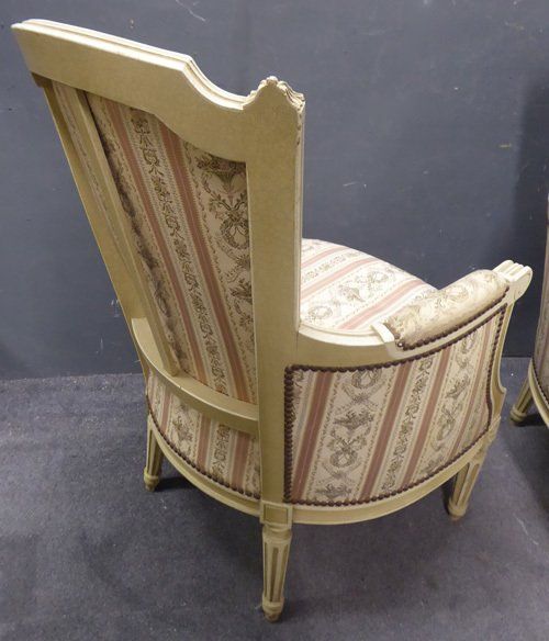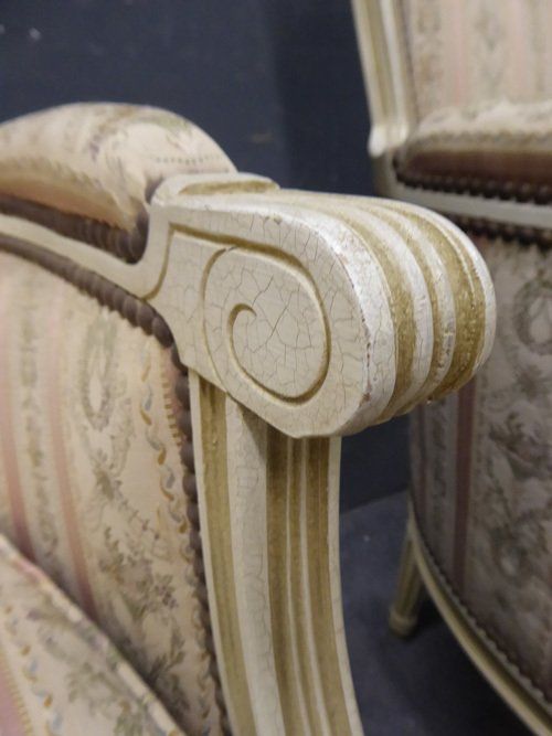 Ref 7574 - Pair of French Louis XVI style bergere armchairs finished in original two tone cream crackle glazed paint. Good upholstery. Circa 1950.