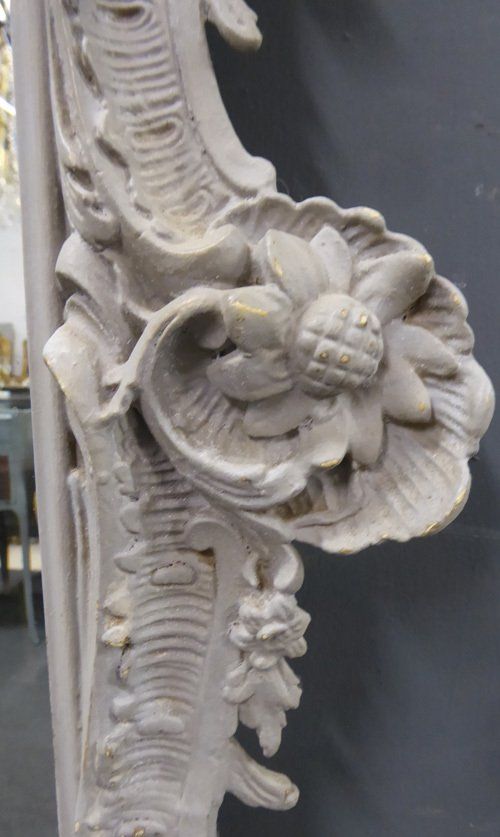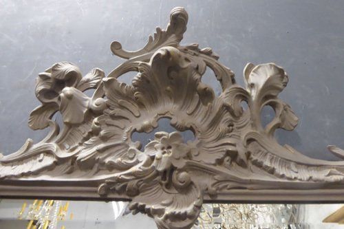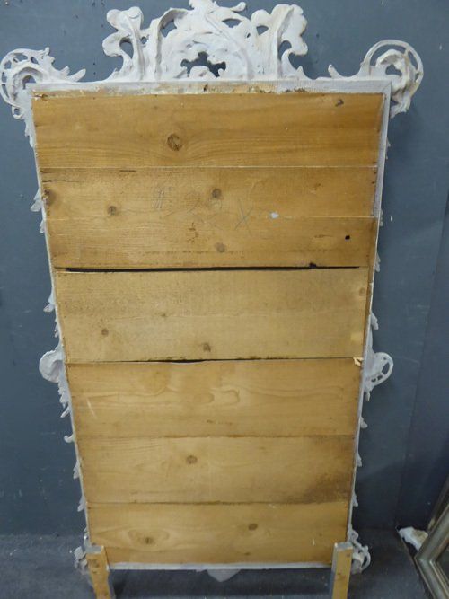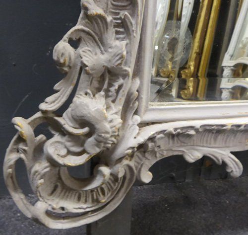 Ref 7577 - Antique French Mirror - Large worn grey painted crested Rococo antique mirror. Original bevelled glass with some patinated areas and small black spots. Original pine board back. Circa 1890.