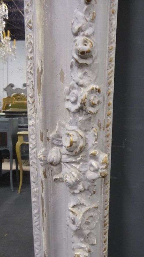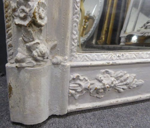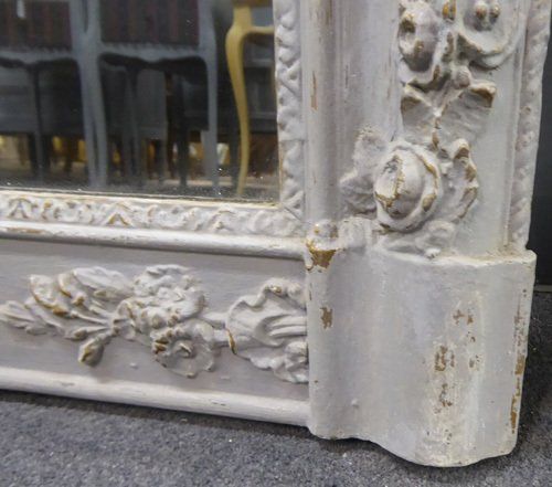 Ref 7578 - Antique French Mirror - Worn grey painted period French Restauration antique mirror with gesso decoration to frame. Original mercury glass with some faint surface scratches. Original pine board back. Circa 1830.