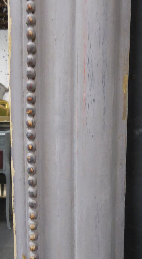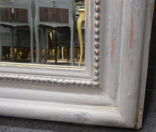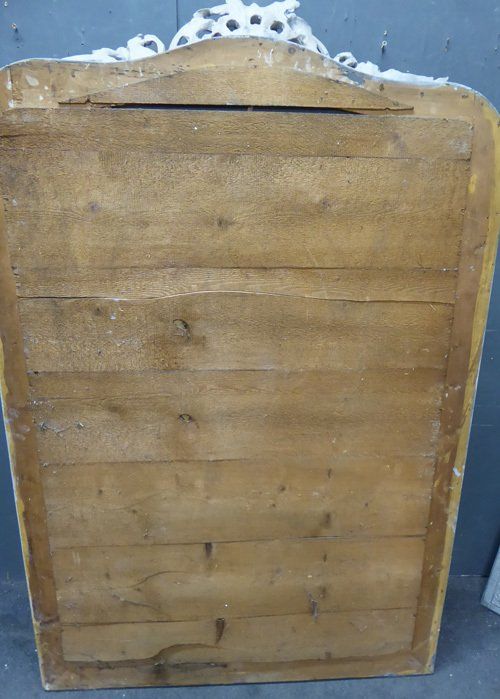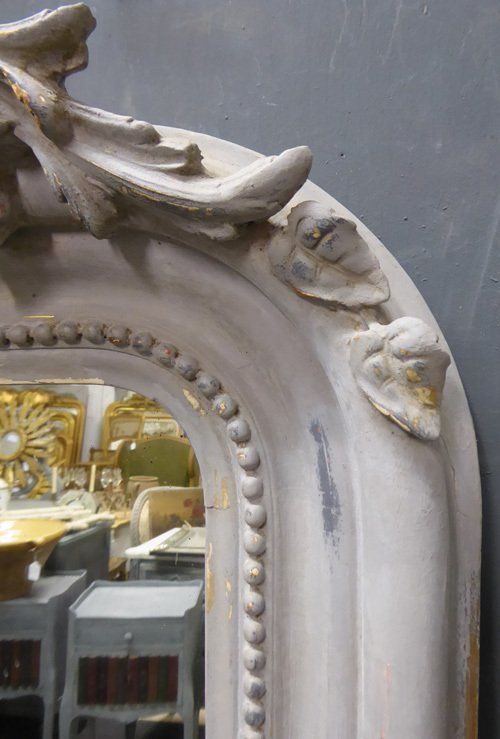 Ref 7584 - Antique French Mirror - Large worn grey painted Louis XV style camel crested antique mirror. Original glass with patinated black spots and faint mottled circles. Original pine board back. Circa 1880.