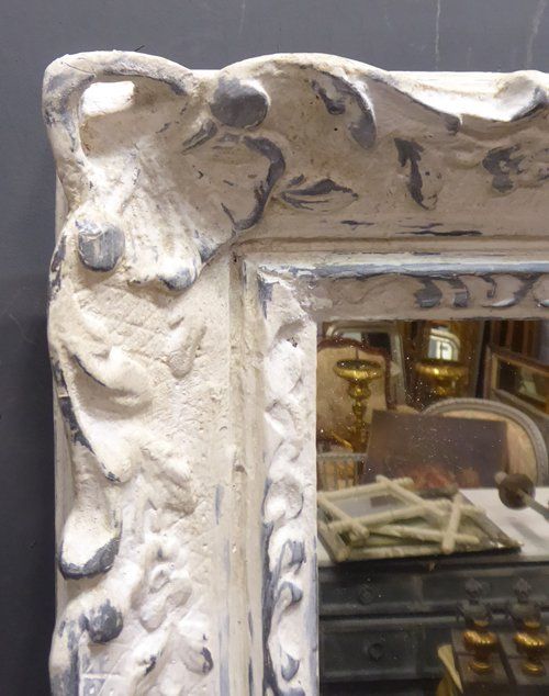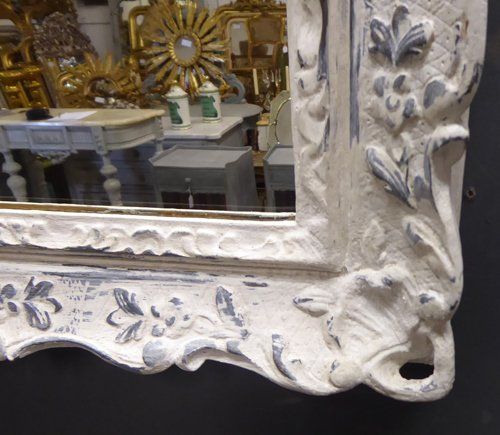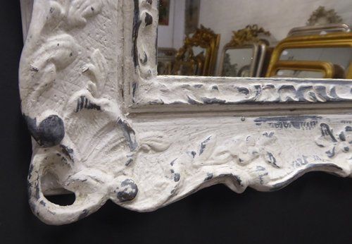 Ref 7593 - Worn white over grey painted decorative vintage French mirror fitted with old glass. Later back. Frame circa 1950.