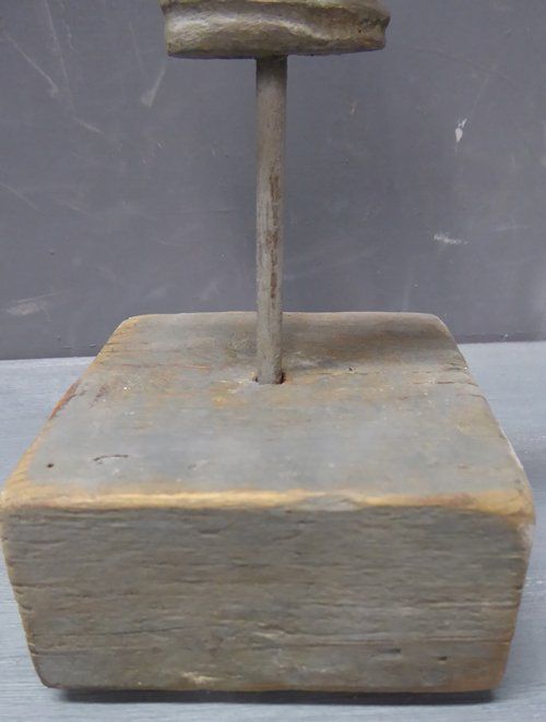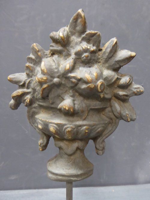 Ref 7594 - Pair of worn grey painted ornaments created from 19th Century French gesso decorations mounted on a distressed painted pine base.