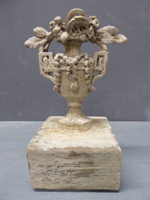 Ref 7595 - Pair of worn grey painted ornaments created from 19th Century French gesso decorations mounted on a distressed painted pine base.