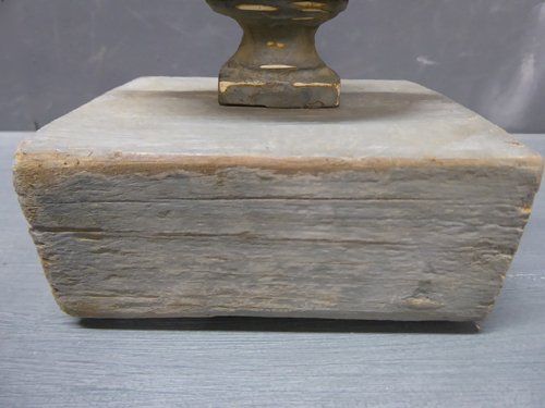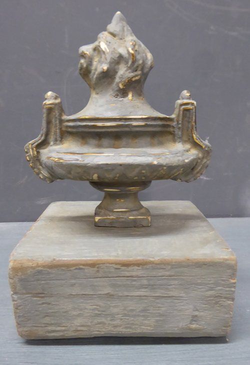 Ref 7597 - Pair of worn grey painted ornaments created from 19th Century French gesso decorations mounted on a distressed painted pine base.