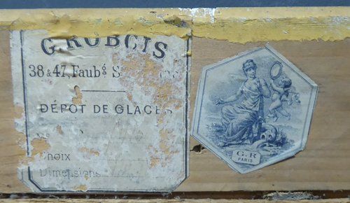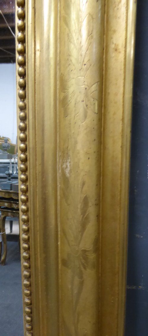 Ref 7603 - Antique French Mirror - Large gilt on black French Louis Philippe antique mirror with flower and leaf etching to frame. Original glass. Original pine board back with Paris stamp. Circa 1880.
