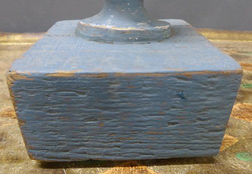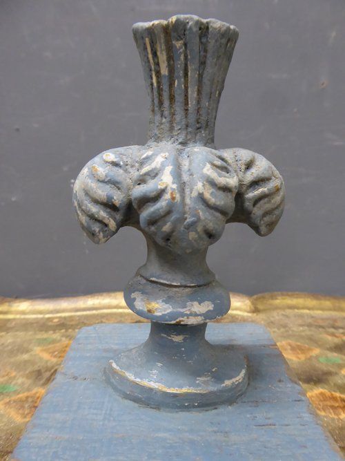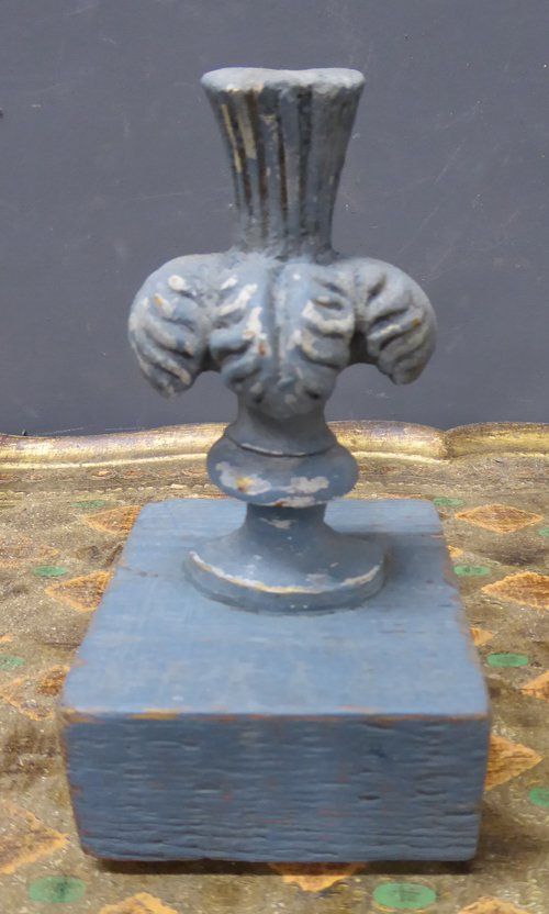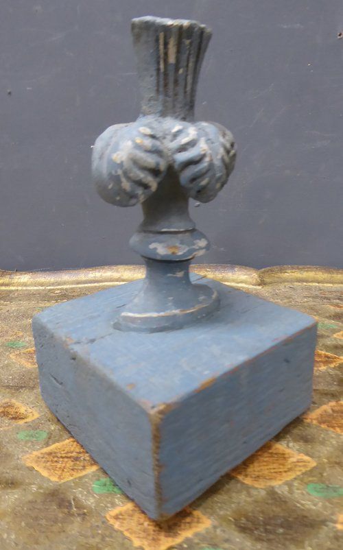 Ref 7608 - Pair of worn dark blue painted ornaments created from 19th Century French gesso decorations mounted on a distressed painted pine base.