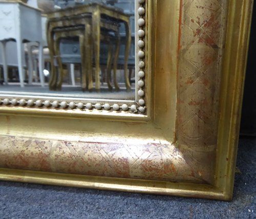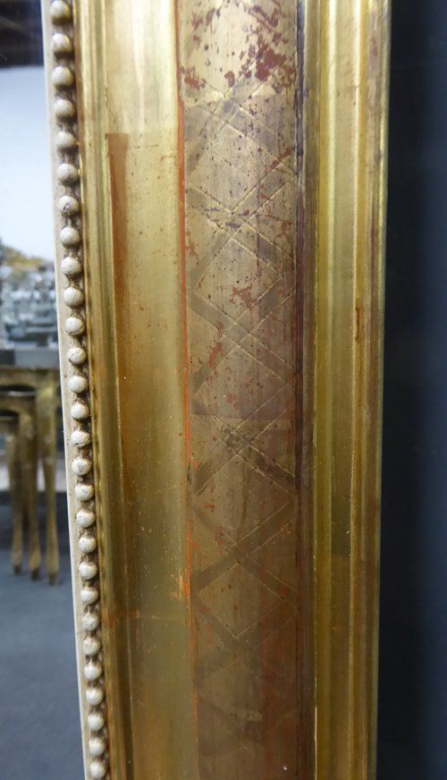 Ref 7615 - Antique French Mirror - Gilt on red Louis Philippe antique with cross hatch etching to frame. Original glass. Original pine board back. Circa 1880.