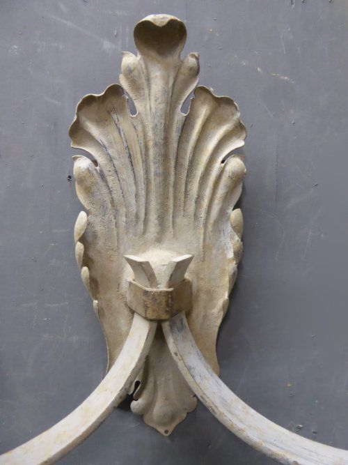 Ref 7616 - Single worn grey painted metal 2 arm wall light with old electrical fittings (not wired). Circa 1950.