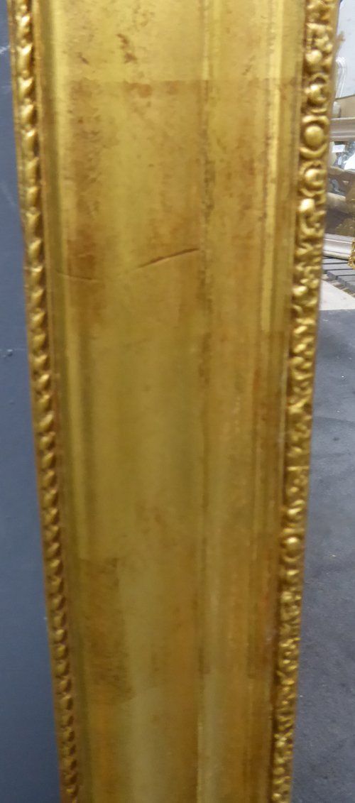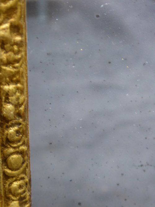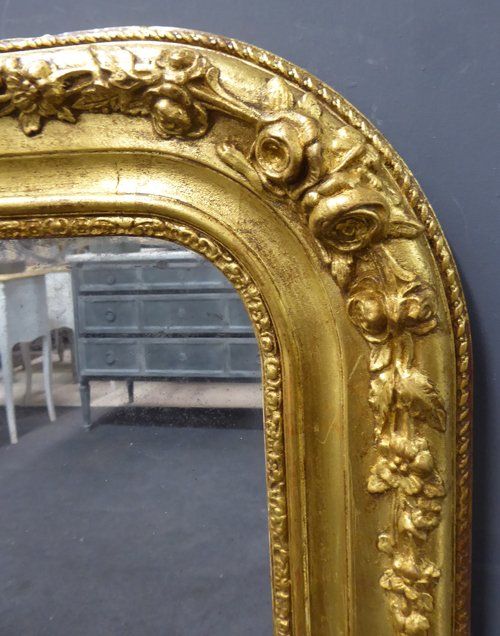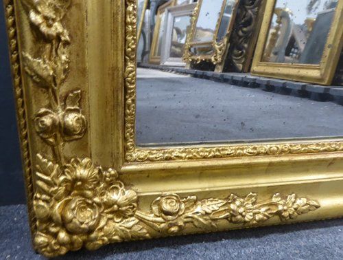Ref 7618 - Antique French Mirror - Gilt on red period Louis Philippe antique mirror with flower decoration to frame. Original patinated mercury glass. Original pine board back. Circa 1840.