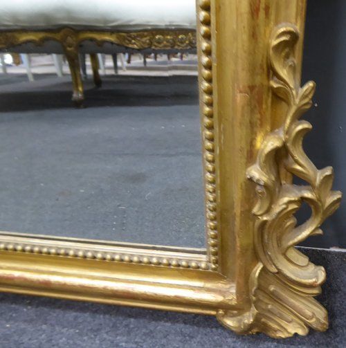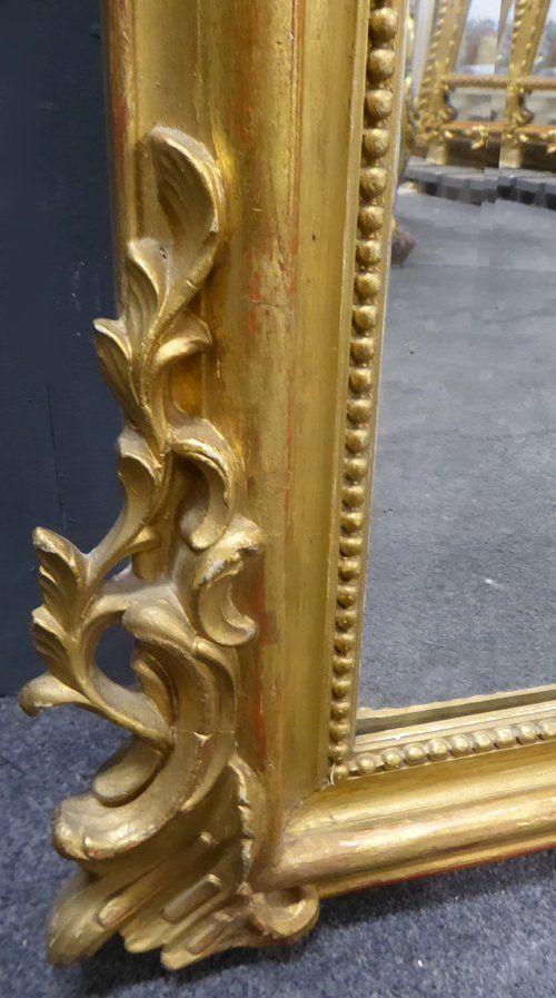 Ref 7621 - Antique French Mirror - Gilt on red Louis XV style camel crested antique mirror. Original bevelled glass with some faint black patination spots. Original pine board back. Circa 1890.