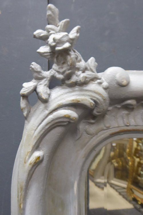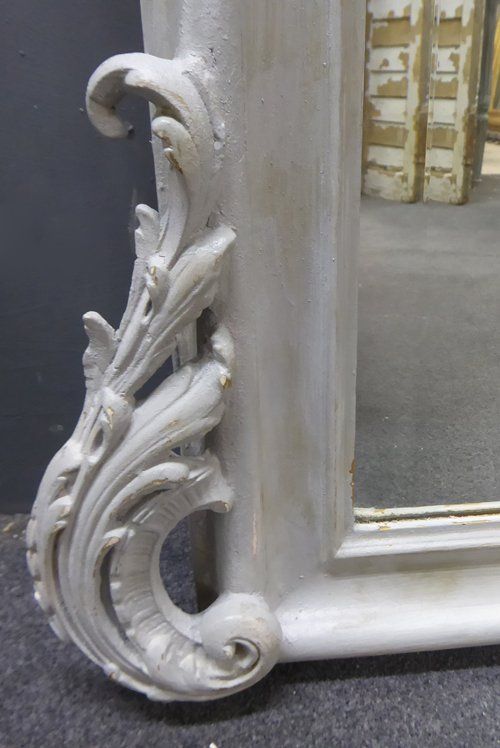 Ref 7624 - Antique French Mirror - Worn grey painted Louis XV style camel crested antique mirror with gesso decoration to frame. Original bevelled glass. New back. Circa 1900.