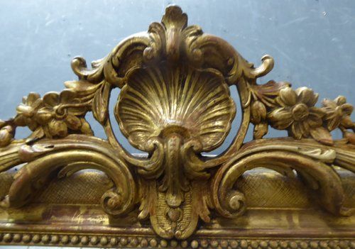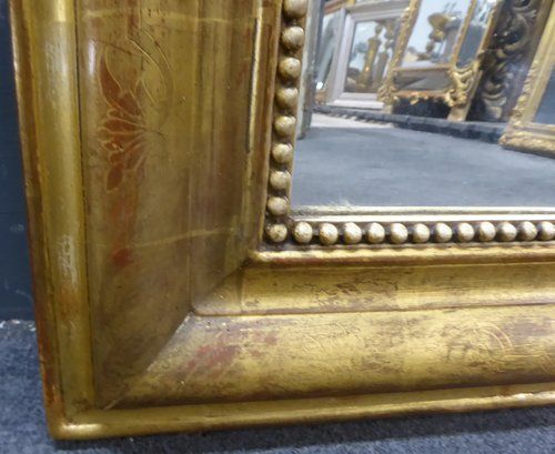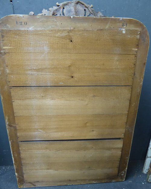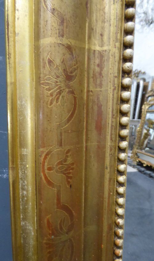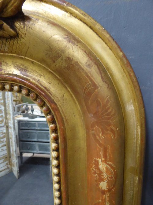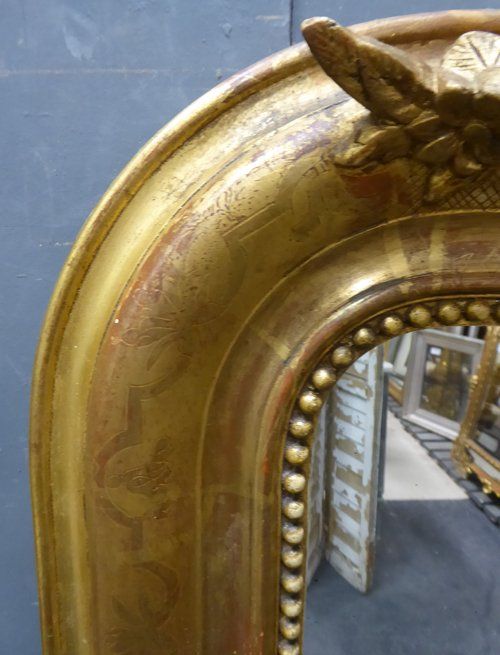 Ref 7625 - Antique French Mirror - Gilt on red crested Louis Philippe antique mirror with geometric and flower etching to frame. Original glass with some small black spots and faint mottled areas. Original pine board back. Circa 1880.