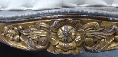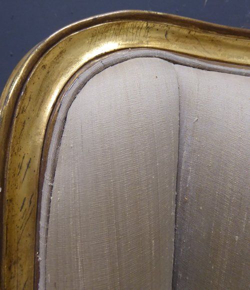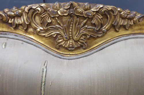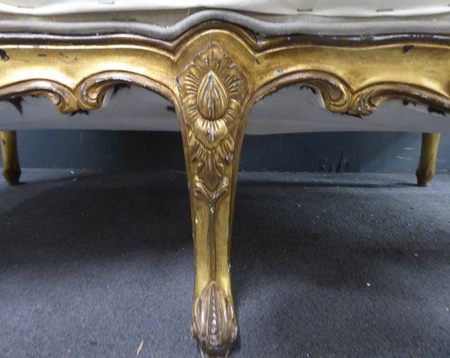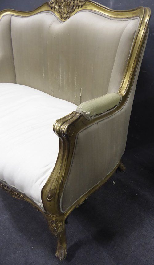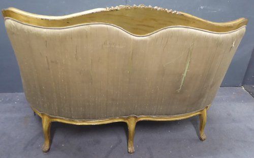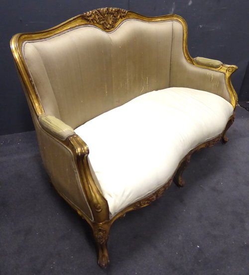 Ref 7628 - Gilt on black Louis XV style French sofa. Some original shot silk covering, later cotton cover to seat pad. Circa 1950.