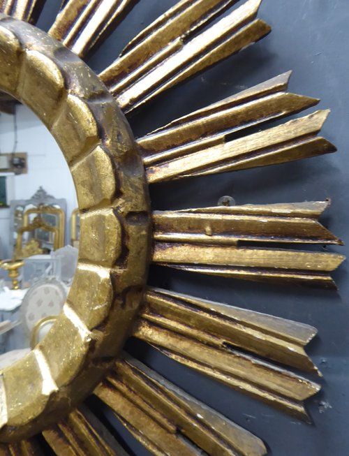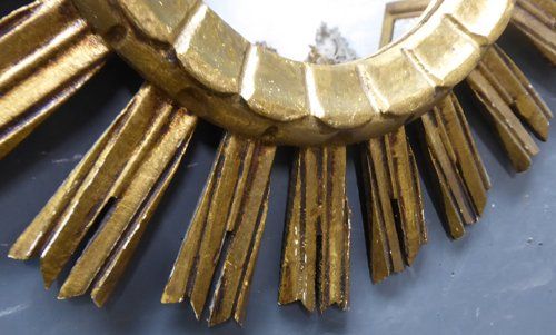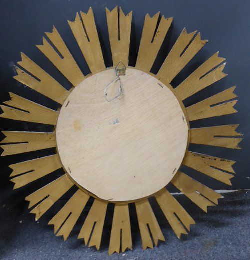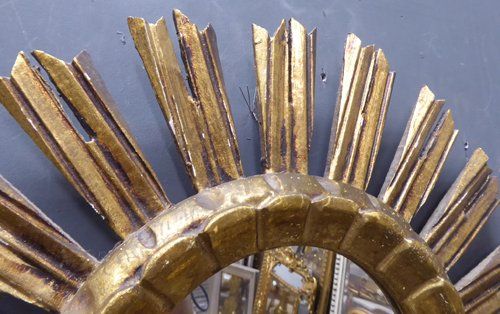 Ref 7635 - Carved giltwood sunburst mirror with original glass. Circa 1960.