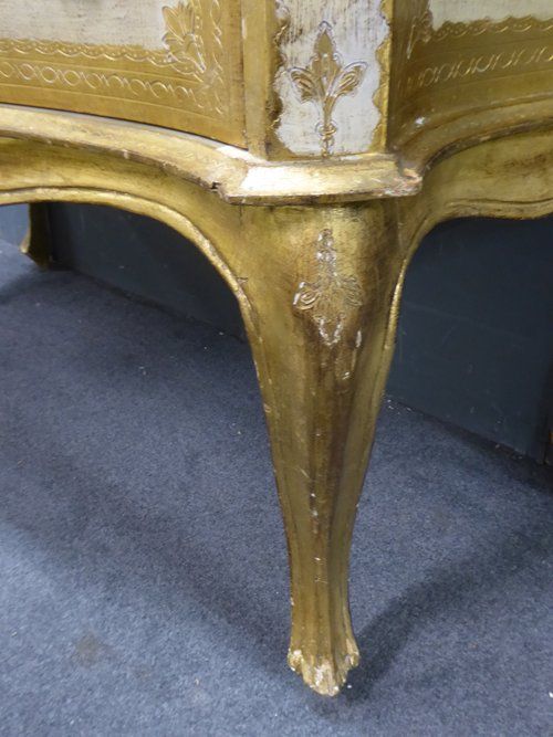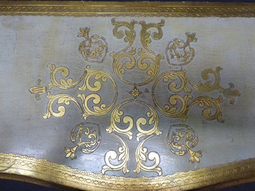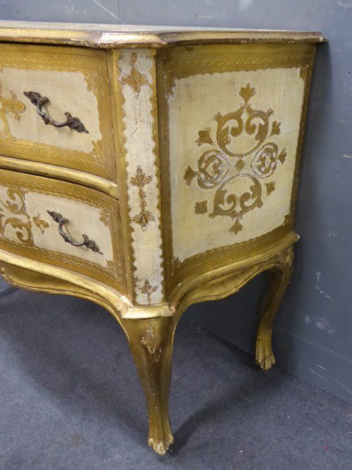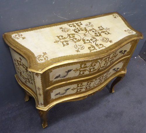 Ref 7648 - Vintage Italian two drawer cabinet finished in original gilt and paint with embossed decoration. Original metal handles. Circa 1950.