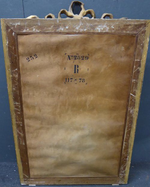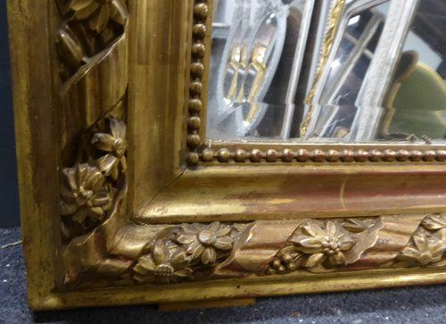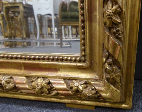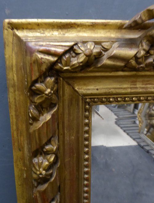 Ref 7655 - Antique French Mirror - Gilt on red ribbon crested antique mirror with gesso decoration to frame. Original bevelled glass. Original thin veneer back. Circa 1890.