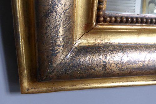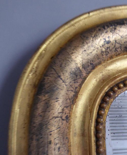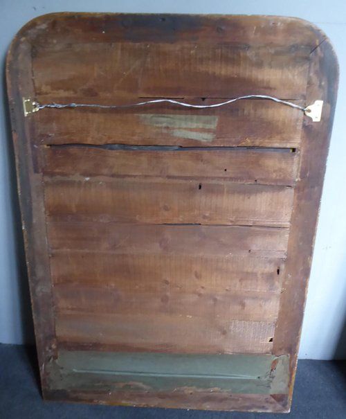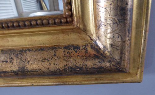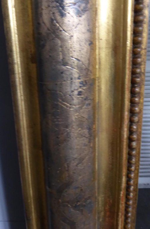 Ref 7656 - Antique French Mirror - Gilt on red Louis Philippe antique with a pale gilt on black etched band. Original glass with some patination marks to top of plate (see close-up). Original pine board back. Circa 1880.
