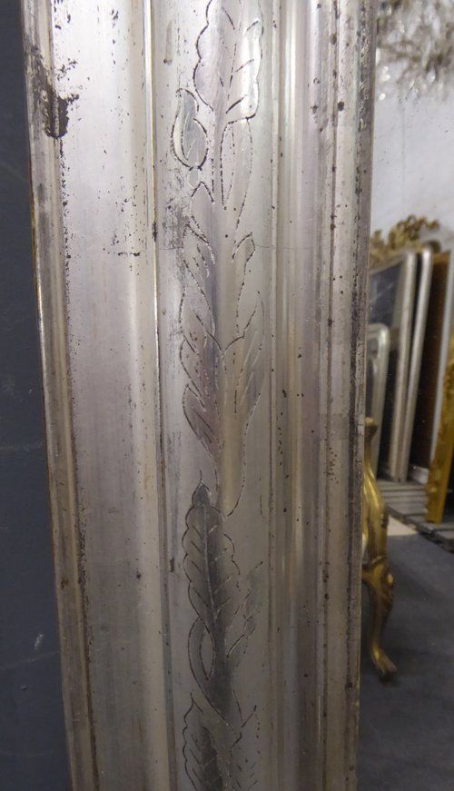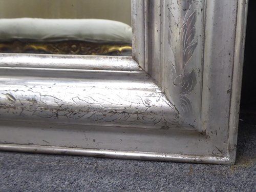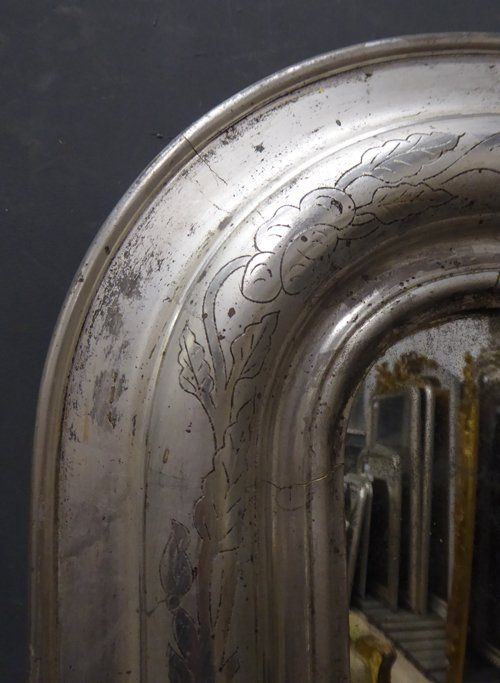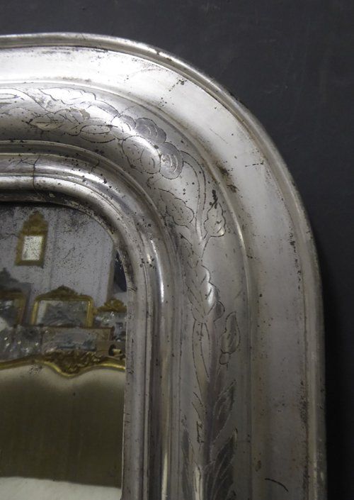 Ref 7665 - Antique French Mirror - Large silver on black period Louis Philippe antique mirror with flower and leaf etching to frame. Original mercury glass with some patination marks. Original pine board back. Circa 1840.
