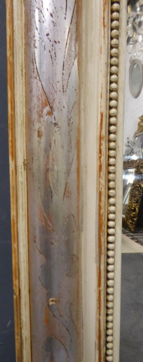 Ref 7666 - Antique French Mirror - Crested Louis Philippe antique mirror finished in polished cream/off white gesso with worn silver on red etched bands to frame. Original glass with some faint mottled lines to back to plate. Original patinated bevelled mirror in crest. Original pine board back. Circa 1880.