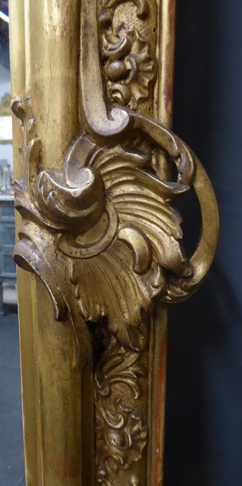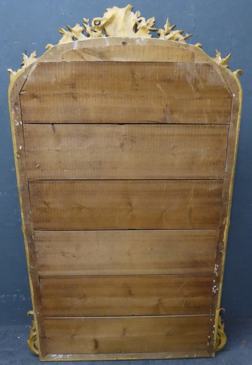 Ref 7667 - Antique French Mirror - Gilt on red crested antique mirror with gesso decoration to frame. Original bevelled glass. Original pine board back. Circa 1890.