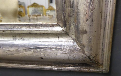 Ref 7669 - Antique French Mirror - Silver on black Louis Philippe antique mirror with flower and leaf etching to frame. Original faintly patinated glass. Original pine board back. Circa 1860.
