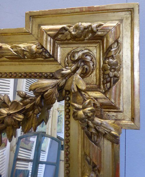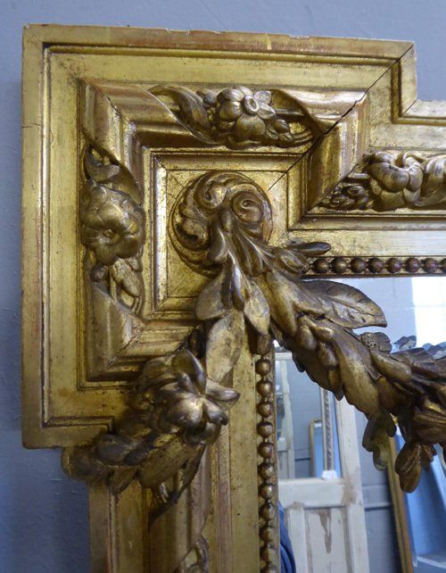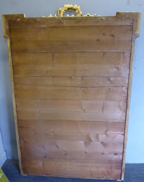 Ref 7678 - Antique French Mirror - Large gilt on red Louis XVI style antique mirror with gesso crest, swags and ribbon with flower decoration to frame. Finished in original two tone gilt worn through to red in places. Original lightly patinated glass. Original pine board back. Circa 1880.