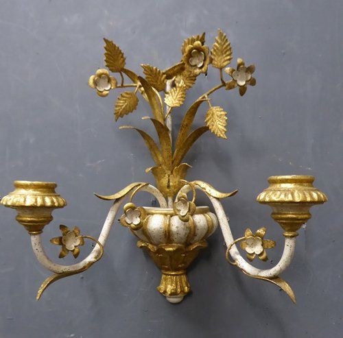 Ref 7692 - Pair of vintage Italian two arm flower and leaf decorated wood and metal wall lights finished in original gilt and patinated white paint. For candles or can be wired. Circa 1950.
