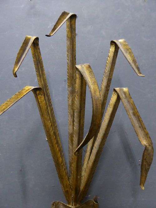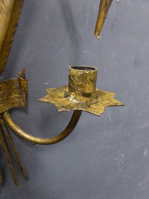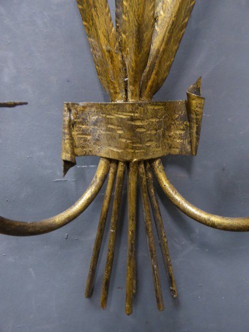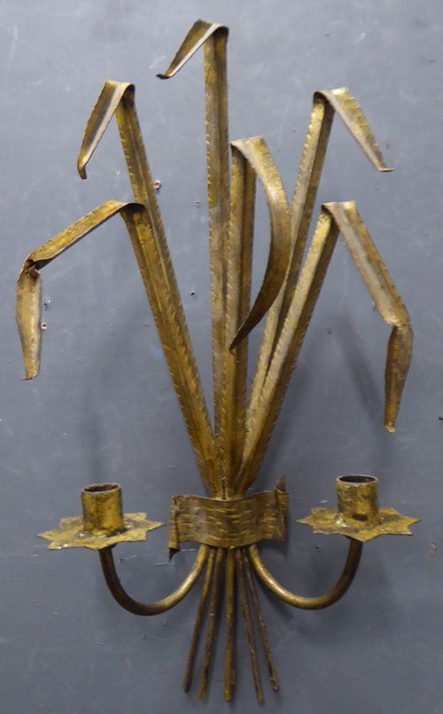 Ref 7698 - Pair of vintage Italian gilt painted metal two arm rush leaf decorated wall lights. For candles or can be wired. Circa 1950.