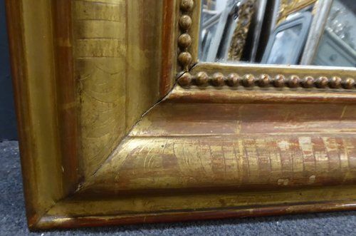 Ref 7706 - Antique French Mirror - Gilt on red Louis Philippe antique mirror with line etching to frame. Original glass. Original pine board back with old brown paper cover. Circa 1880.