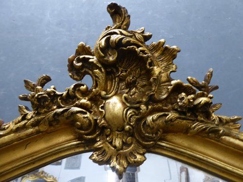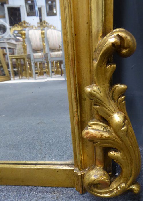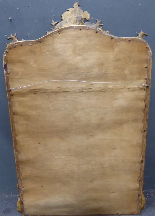 Ref 7707 - Antique French Mirror - Gilt on red camel crested Louis XV style antique mirror with gesso decoration to corners. Original bevelled glass with some small black patination spots. Original thin veneer back. Circa 1890.