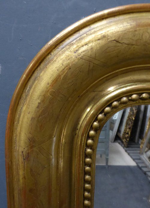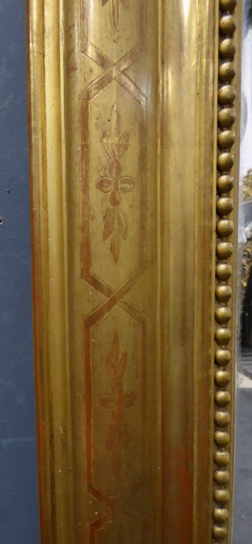 Ref 7710 - Antique French Mirror - Gilt on red Louis Philippe antique mirror with geometric and flower etching to frame. Original glass. Original pine board back. Circa 1880.
