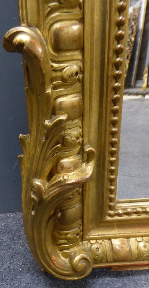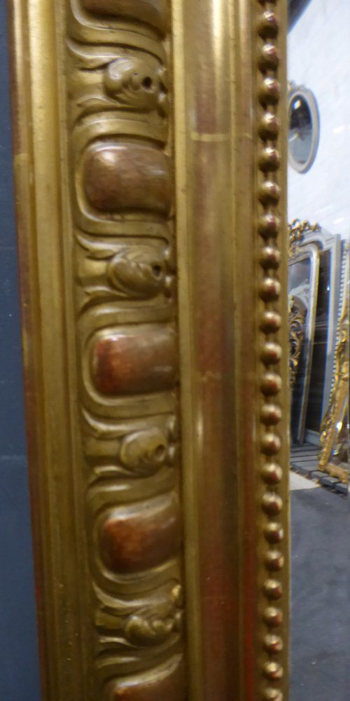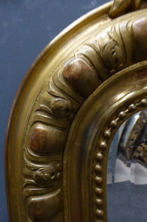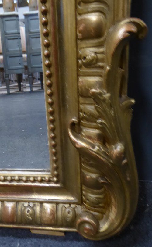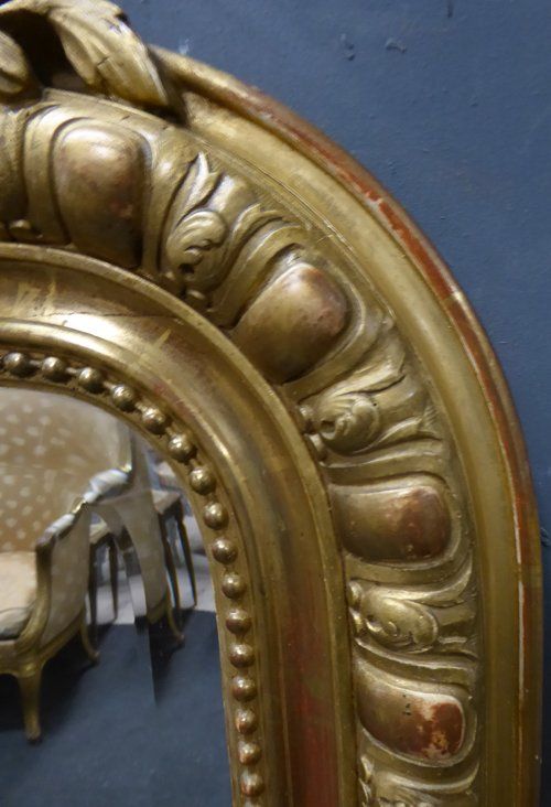 Ref 7712 - Antique French Mirror - Camel crested gilt on red Napoleon III antique mirror with gesso decoration to frame. Original bevelled glass. Original pine board back. Circa 1890.