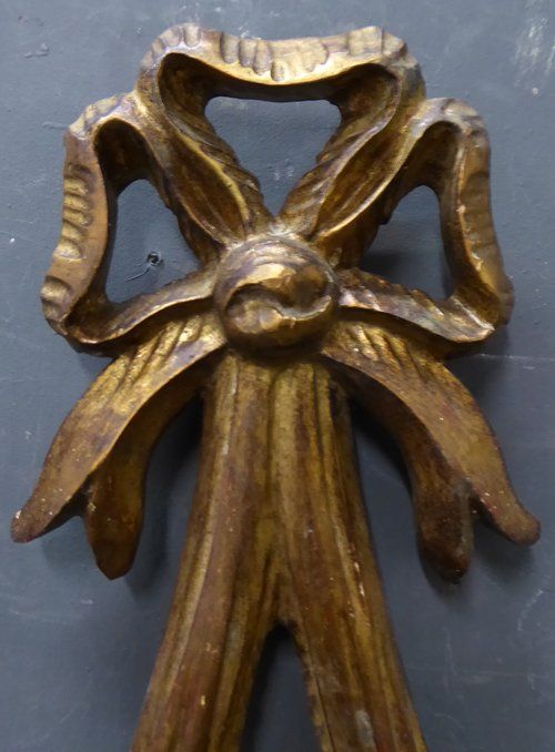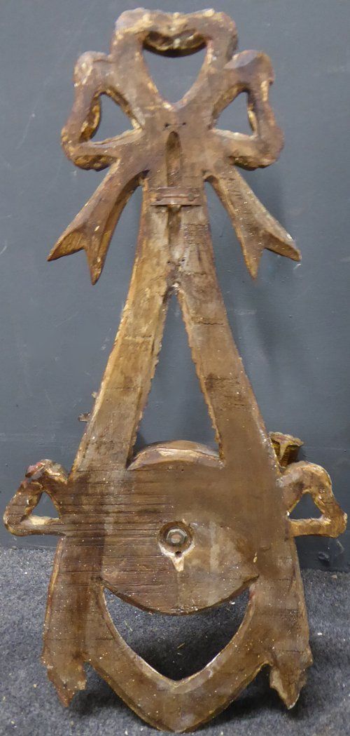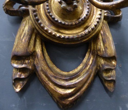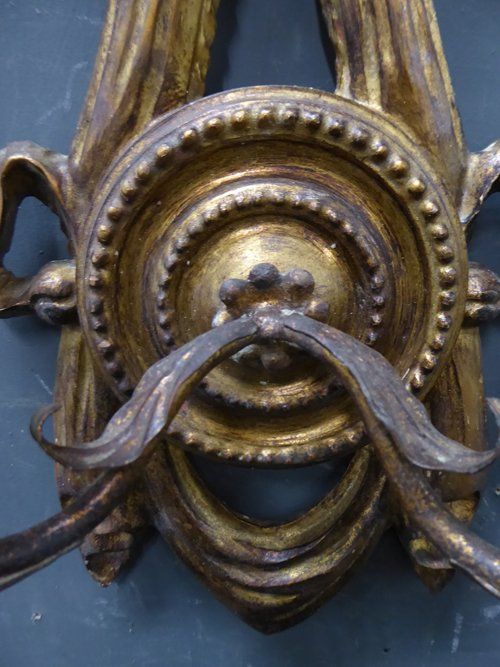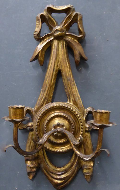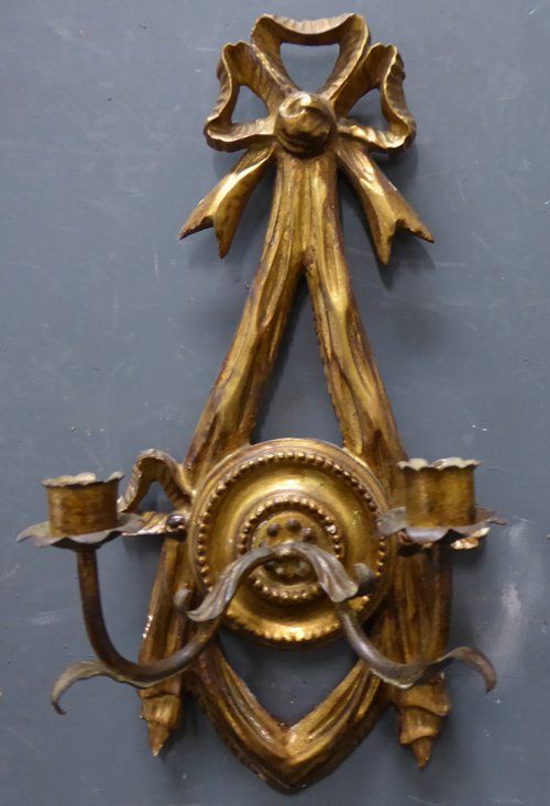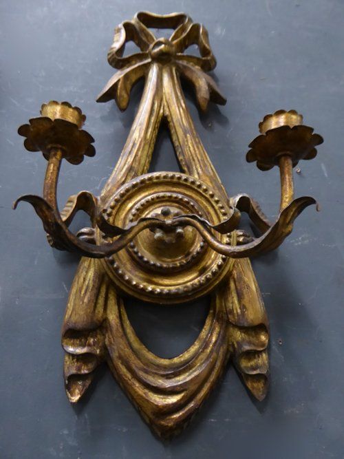 Ref 7716 - Pair of two arm carved giltwood and gilt metal ribbon wall lights. For candles or can be wired. Circa 1950.