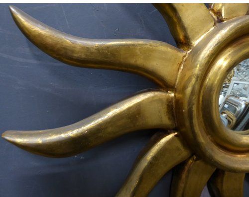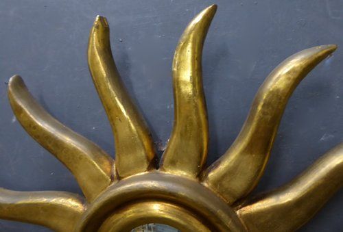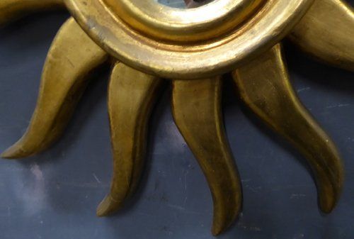 Ref 7725 - Carved giltwood sunburst mirror with original convex glass. Circa 1950.