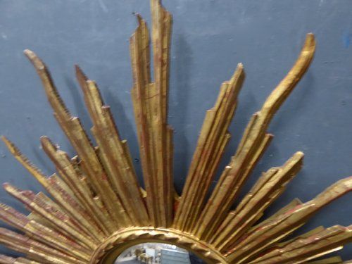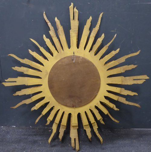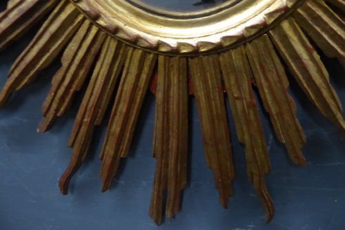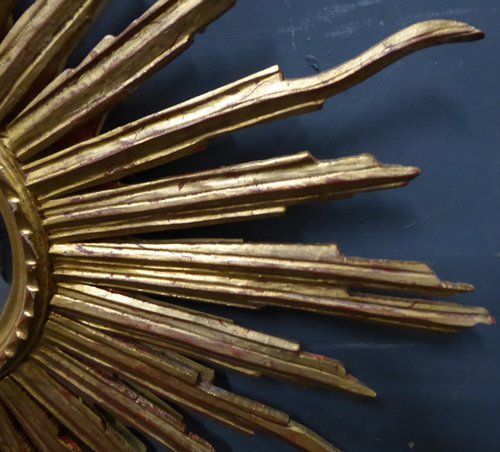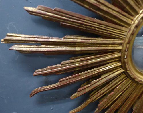 Ref 7726 - Carved giltwood sunburst mirror with original convex glass. Circa 1950.