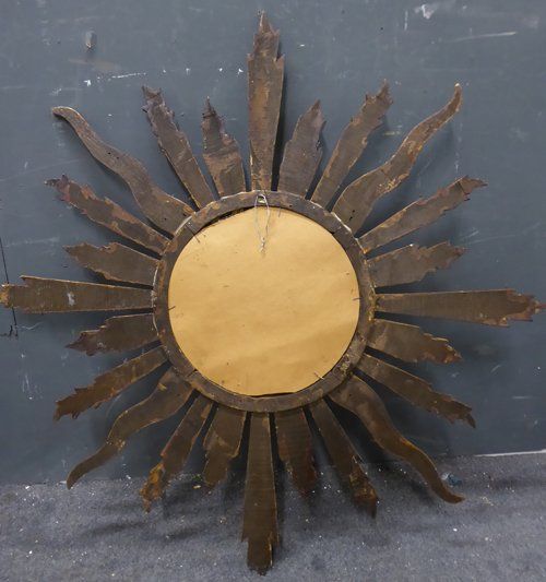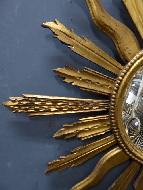 Ref 7727 - Carved giltwood sunburst mirror with original convex glass. Circa 1950.