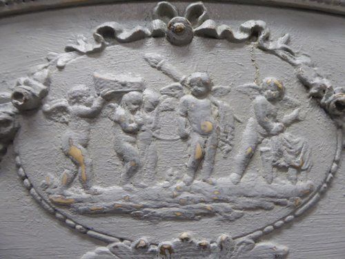 Ref 7732 - Antique French Mirror - Worn grey painted crested antique trumeau mirror with cherub and swag detail to panel. Original bevelled glass with black patination spots (see close-up). New back. Circa 1890.