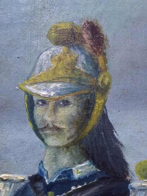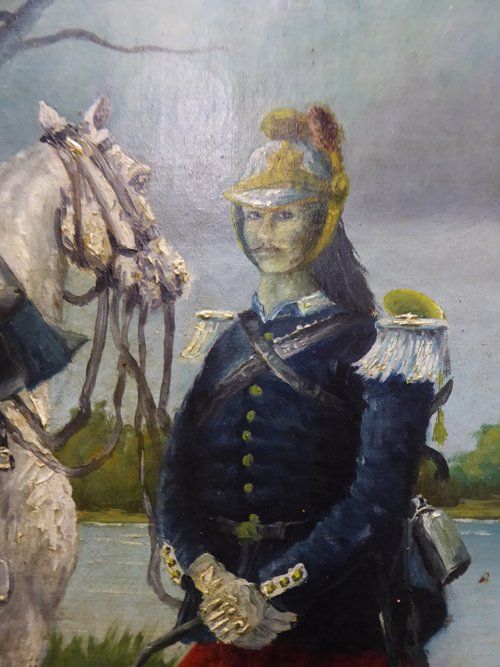 Ref 7736 - 19th Century Antique French oil on canvas portrait of a French cavalry officer and horse. Unrestored with some old patched repairs. Signed A.Levesque.