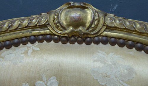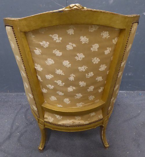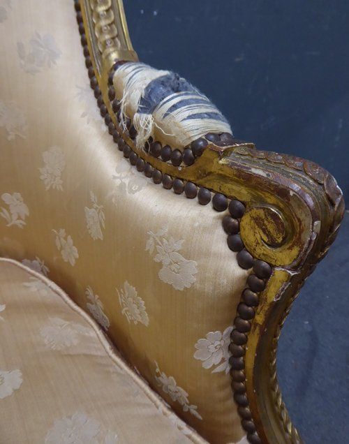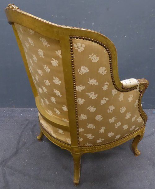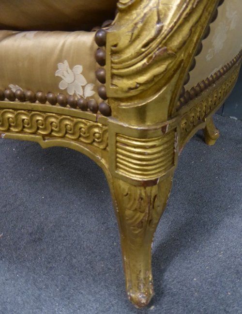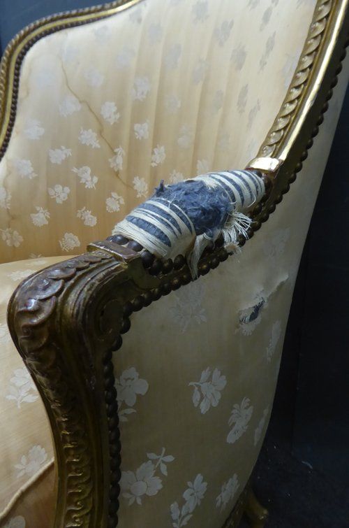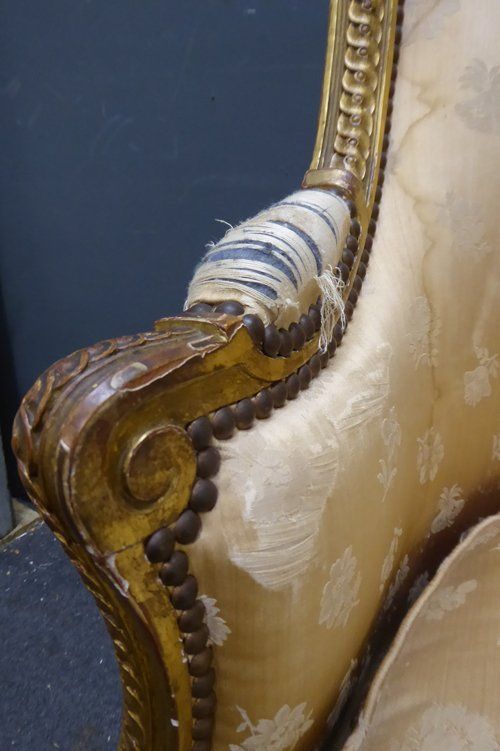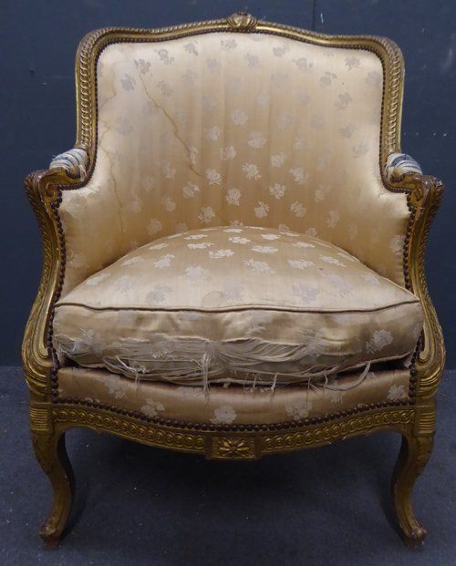 Ref 7737 - Carved giltwood antique French armchair finished in original worn silk fabric. Some tears and staining. Circa 1900.