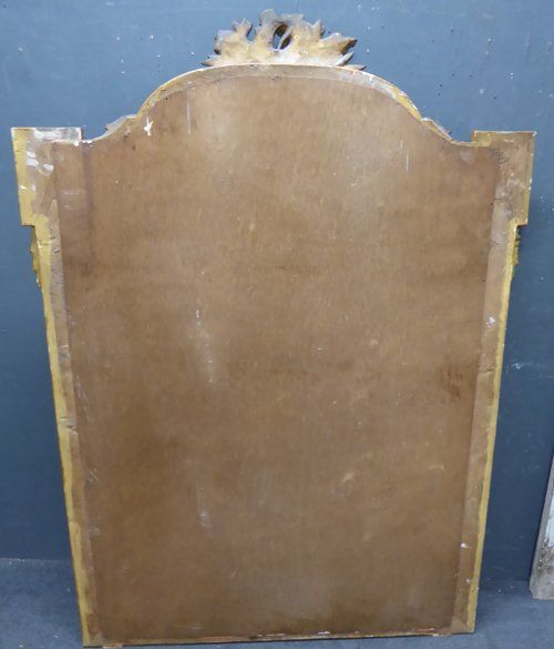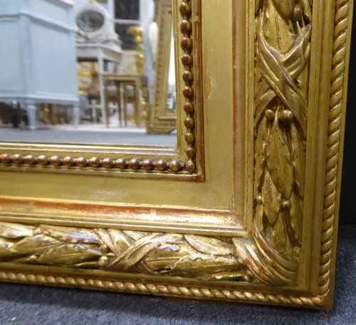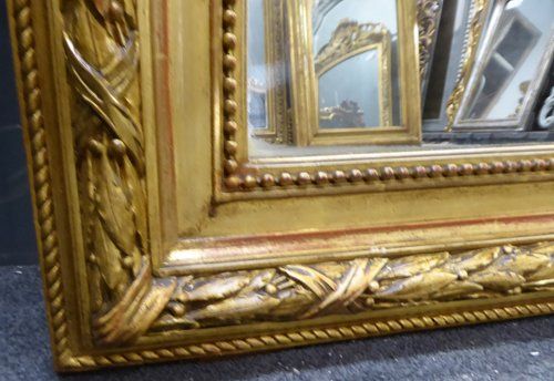 Ref 7738 - Antique French Mirror - Large gilt on red Louis XVI style antique crested mirror with gesso decoration to frame. Original bevelled glass with some faint manufacturing wipe marks to back of plate. Old replaced back. Circa 1890.