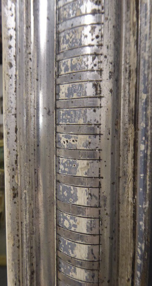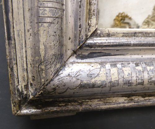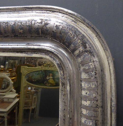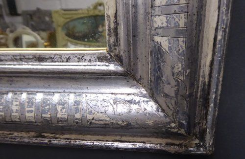 Ref 7740 - Antique French Mirror - Silver on black Louis Philippe antique mirror with line etching to frame. Original silver leaf worn through to white gesso in places. Original glass with a 1.5" scratch to lower centre of plate (see close-up). Original pine board back. Circa 1880.