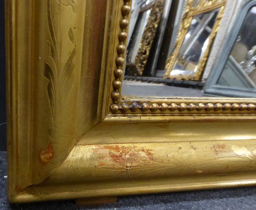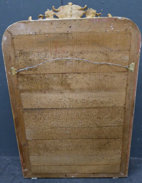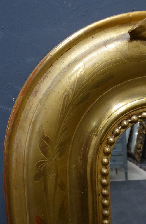 Ref 7741 - Antique French Mirror - Gilt on red crested Louis Philippe antique mirror with flower and leaf etching to frame. Original glass. Original pine board back. Circa 1880.