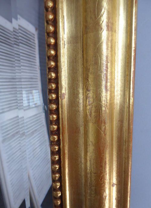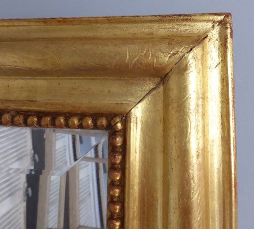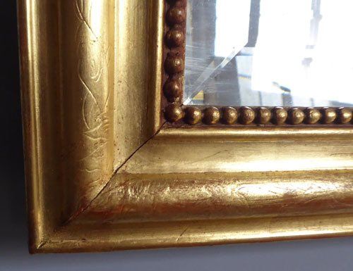 Ref 7743 - Antique French Mirror - Gilt on red landscape/portrait Louis Philippe antique mirror with flower and leaf etching to frame. Original bevelled glass with some small surface scratches. Original pine board back. Circa 1880.
