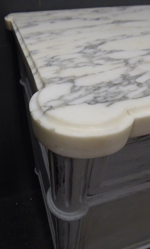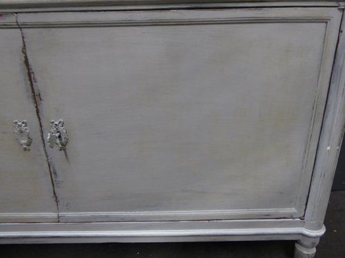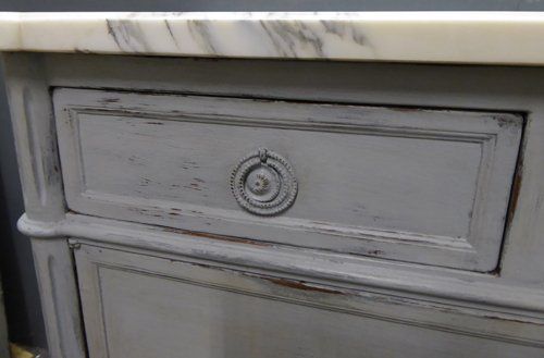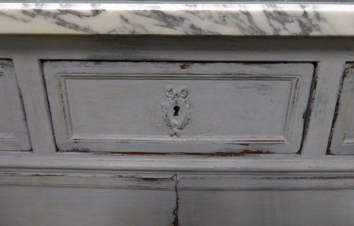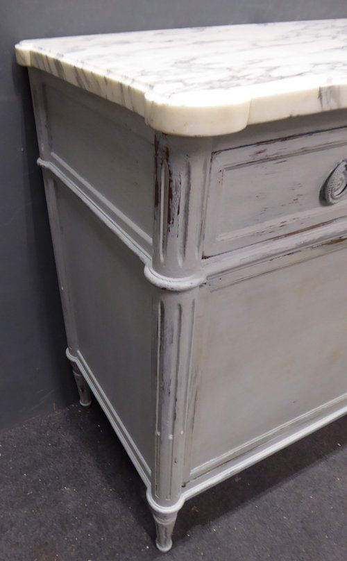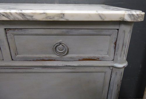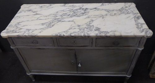 Ref 7745 - French Louis XVI style worn grey painted three drawer buffet. Two door cupboard. with adjustable shelf. Original shaped marble top. Circa 1900.