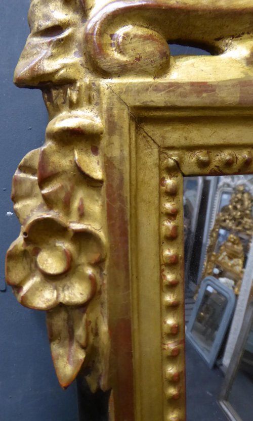 Ref 7756 - Antique French Mirror - Carved giltwood urn and flower crested antique French mirror. Original sparkly mercury glass. Original pine board back. Some old treated woodworm holes to back. Circa 1820.