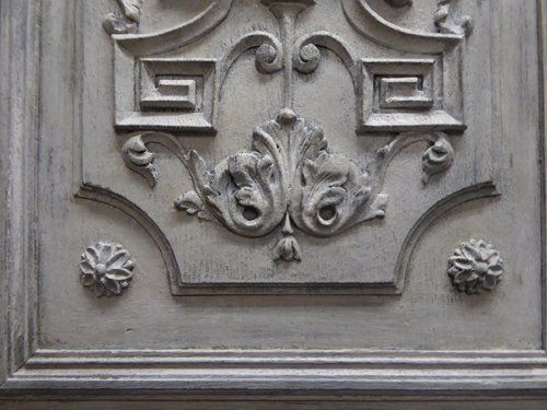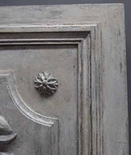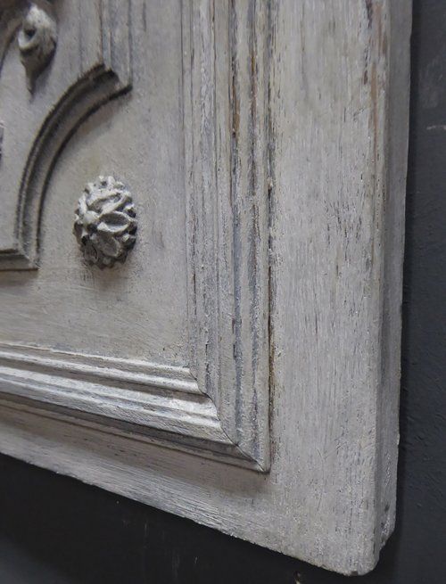 Ref 7757 - Antique French worn grey painted carved oak decorative panel. Circa 1900.