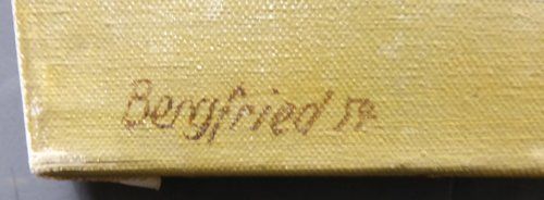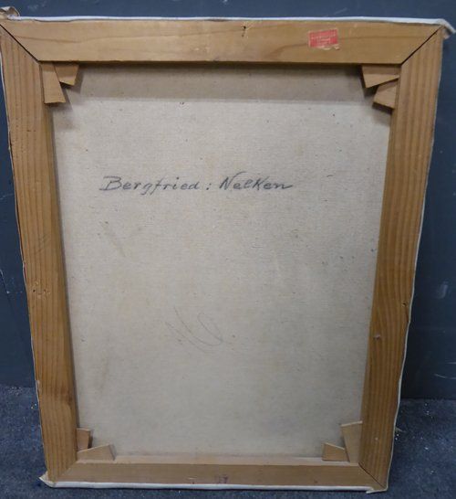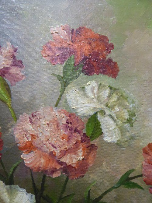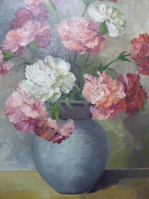 Ref 7760 - Oil on canvas still life of carnations. Signed Bergfried front and reverse. Dated 1954.