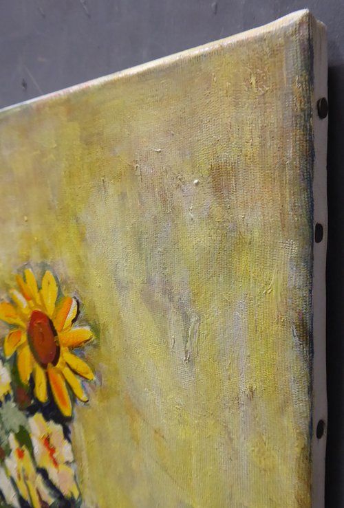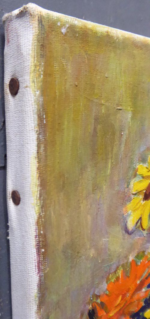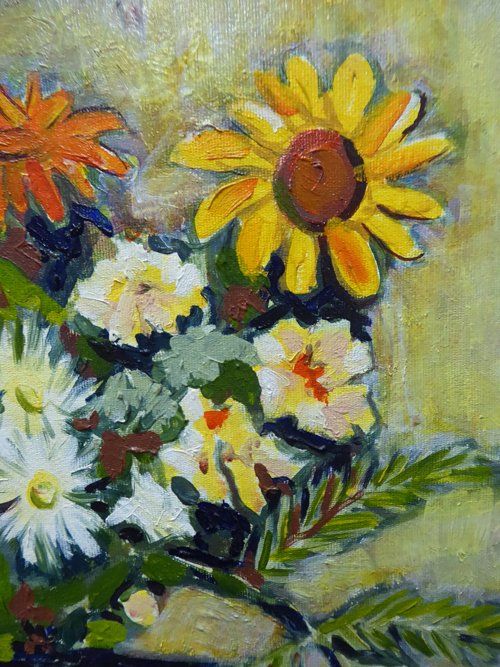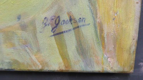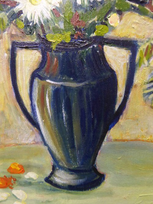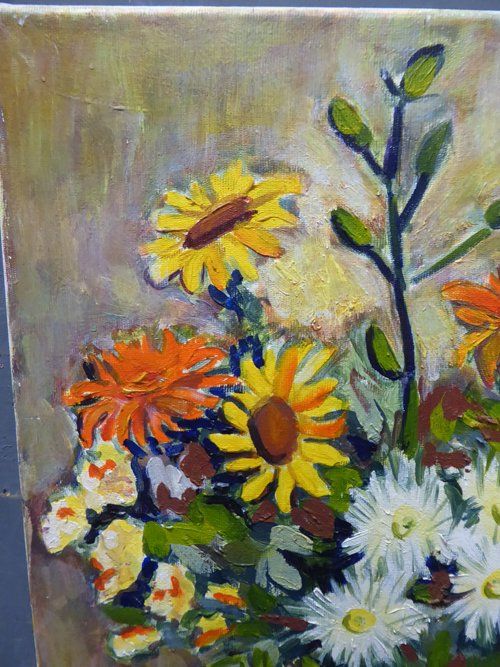 Ref 7764 - French oil on canvas still life of vase of flowers on original wooden stretcher. Signed P Jackson. Circa 1950.